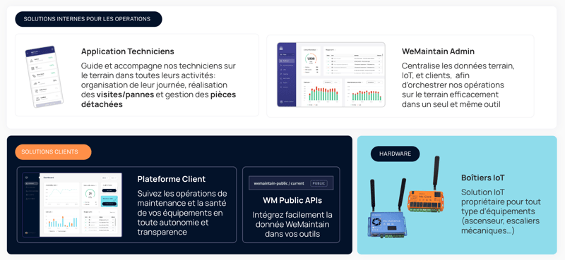 Nous réduisons le taux de panne de 70 %. Les propriétaires et gestionnaires d'immeubles bénéficient d'un technicien dédié, qui a le temps de réparer correctement les ascenseurs. Dès qu'il visite le site, le propriétaire reçoit une notification sur notre application, suivie des rapports d'intervention. De plus, nous équipons les ascenseurs de capteurs connectés qui fournissent des informations sur l'état des installations. Ces données nous donnent une vue d'ensemble des actifs immobiliers afin que nous puissions mieux les gérer.